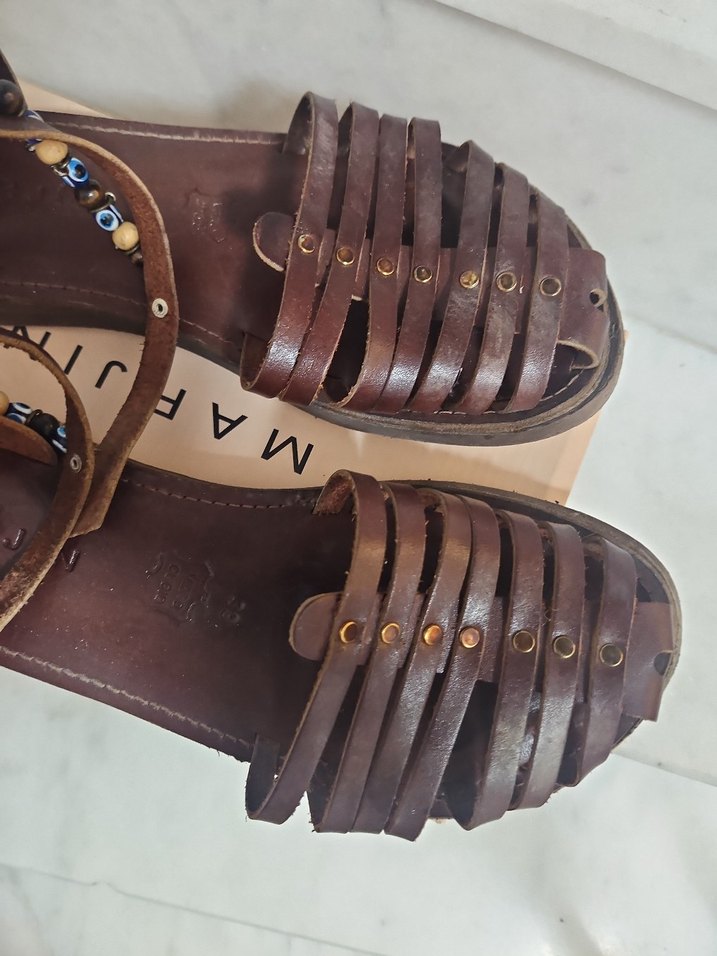 Kahverengi deri kadına özel sandalet, tokalı kayışlar ve nakış detaylarıyla bohem tarzını yansıtıyor. Günlük kullanıma uygun.