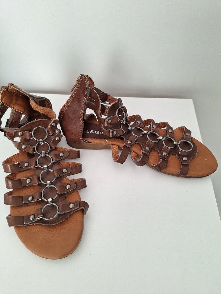 Kahverengi deri, toka detaylı ve desenli kadın sandaletleri. Günlük kullanım için bohem tarzda uygun.
