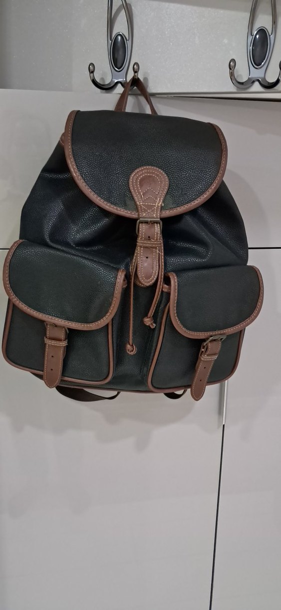 Kahverengi deri, tokalı ve çok cepli kadın sırt çantası, günlük sokak stili için uygundur.