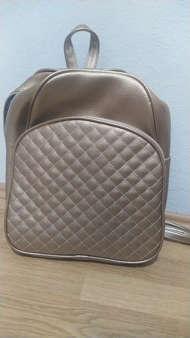 Kahverengi deri kadın sırt çantası, kapitone ön cepli ve tokalı tasarıma sahiptir, günlük kullanım için minimalist tarzda.