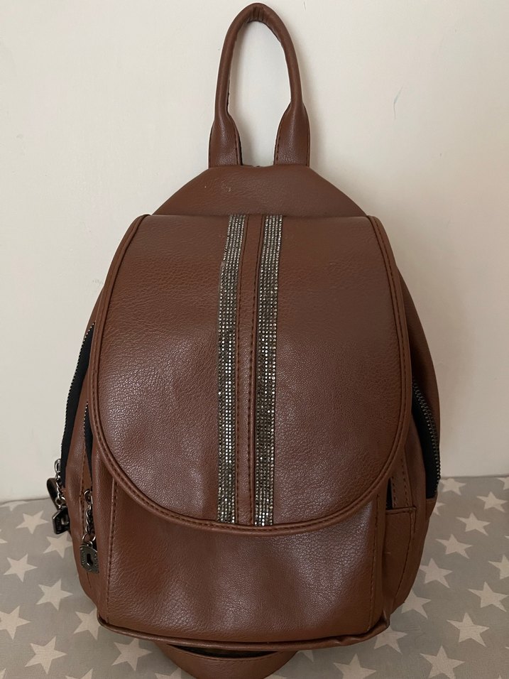 Az kullanılmıştır Parlak kahverengi deri sırt çantası, tokalı kapak ve minimalist biker tarzı ile günlük kullanıma uygundur. Düz ve desensiz tasarıma sahiptir.