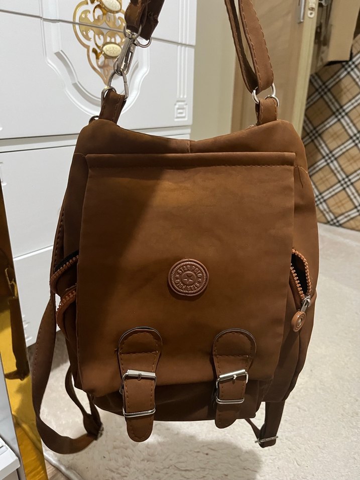 Parlak kahverengi deri sırt çantası, tokalı kayışlara ve minimalist tasarıma sahip, sokak modası ve günlük kullanım için uygundur. Çok gözlü sayılı kullanıldı