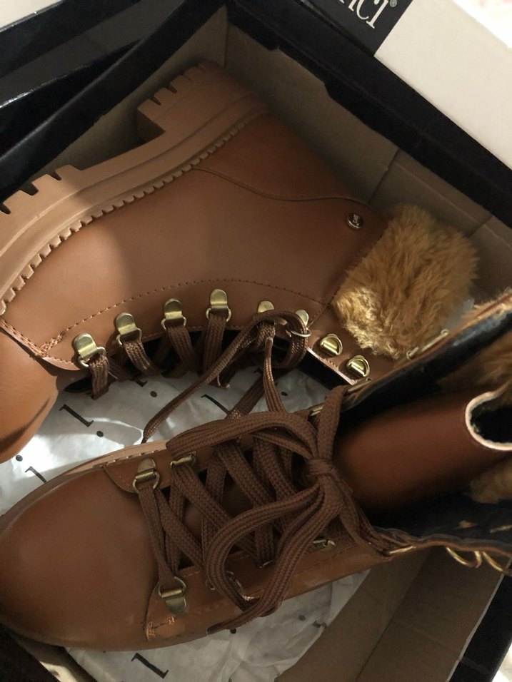 Kahverengi deri kadın botları, tabanlı topuk ve kürk detaylarıyla trendy günlük sokak stiline uygun parlak görünüme sahiptir. Birkez dahi giyilmedi