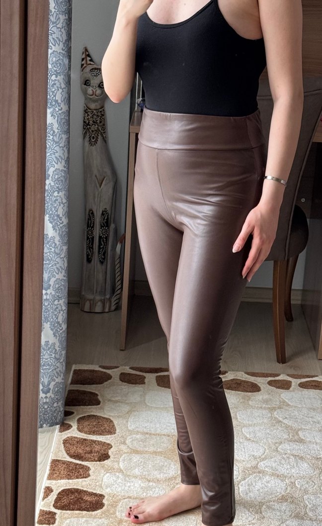 Kahverengi deri, kemerli ve vücuda oturan kadın tayt, günlük sokak stili için uygundur. ✨Hiç giymedim.Kusuru yok.