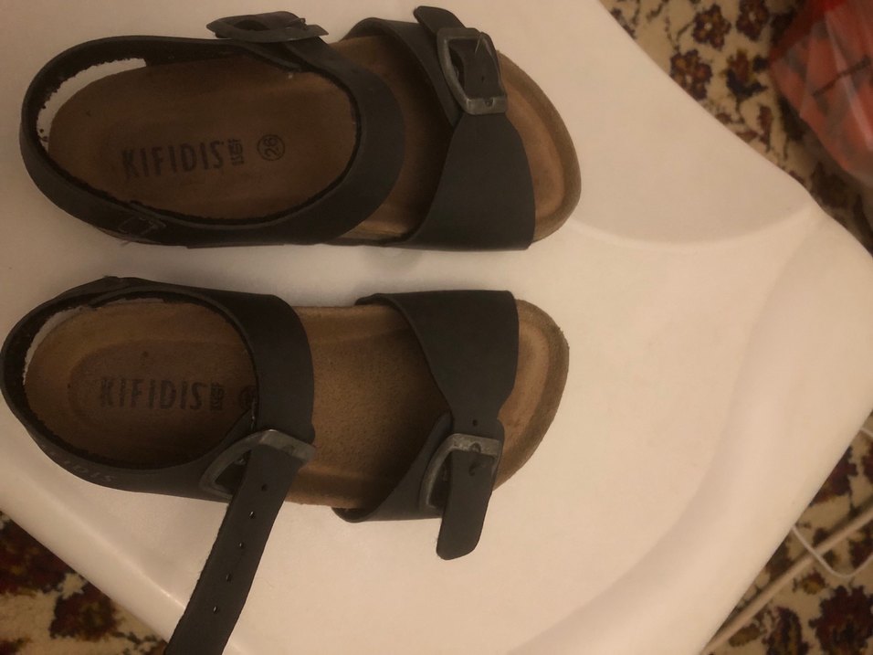 Kahverengi deri, tokalı, dolgu topuklu kadın terlikleri, sade ve minimalist tarzda, günlük kullanım için uygundur.