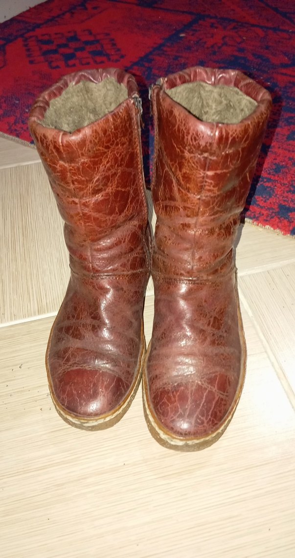 Kahverengi deri ve parlak görünümlü, tokalı kadın botları. Rahat iç astarı ve dolgu topuklu tasarımıyla retro ve bohem tarzı bir arada sunar.