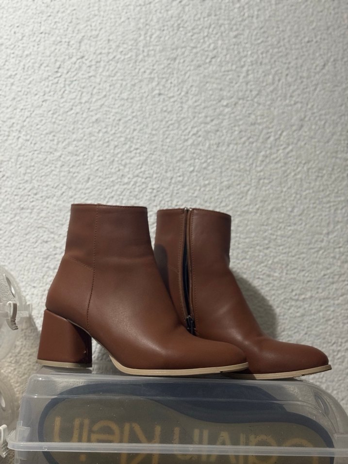 Kahverengi deri ve blok topuklu kadın botları, minimalist ve çağdaş tasarımla günlük kullanıma uygundur. Rahat ve şık bir görünüm sunar.
