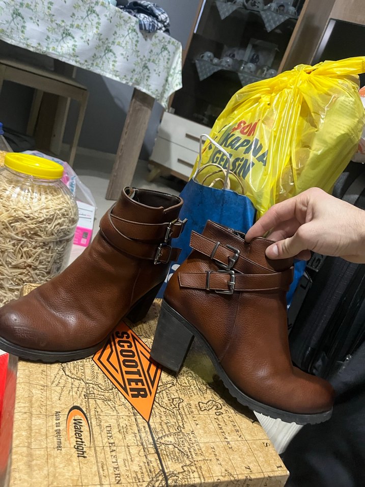 Kahverengi deri kadın botları, blok topuklu ve tokalı kayışlara sahip, yılan desenli, günlük sokak stiline uygun. COOTER tarafından su geçirmez olarak işaretlenmiştir.