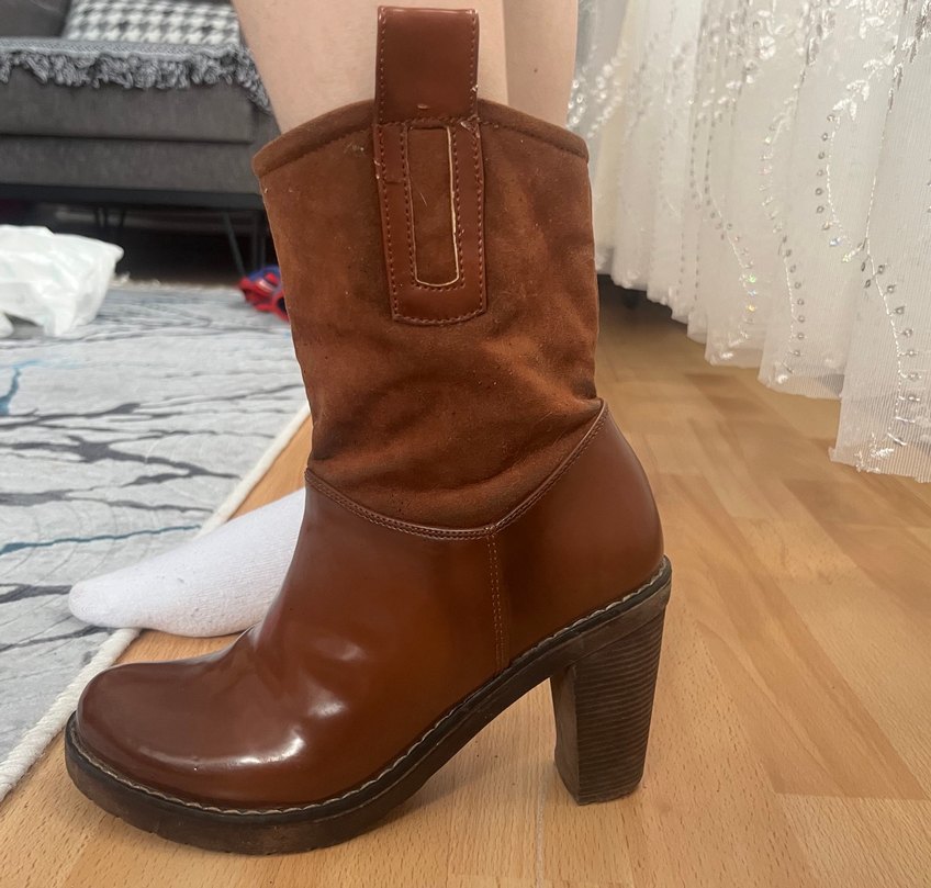 Kahverengi deri kadın botlar, kalın topuklu ve parlak görünüme sahiptir. Bohem tarzda, tokalı detaylı, günlük kullanıma uygundur.