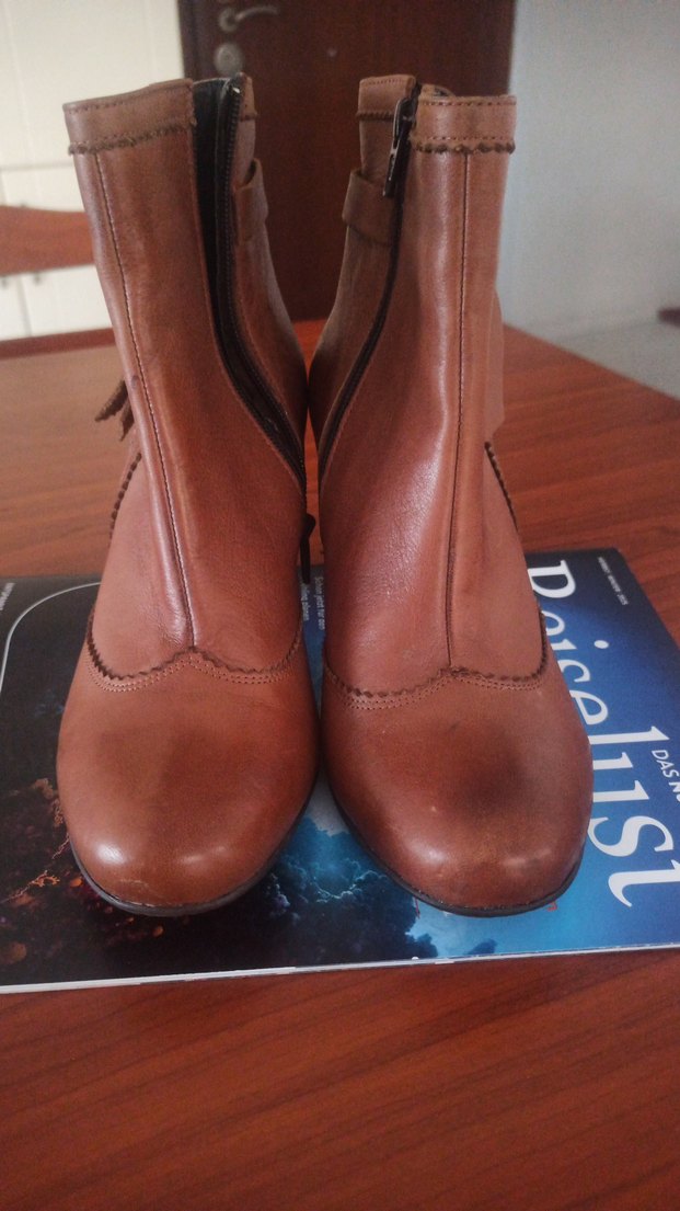 Kahverengi deri, topuklu ve tokalı kadın botları, vintage ve karşı kültür tarzında, günlük kullanıma uygun. Düz ve koyu renklidir.