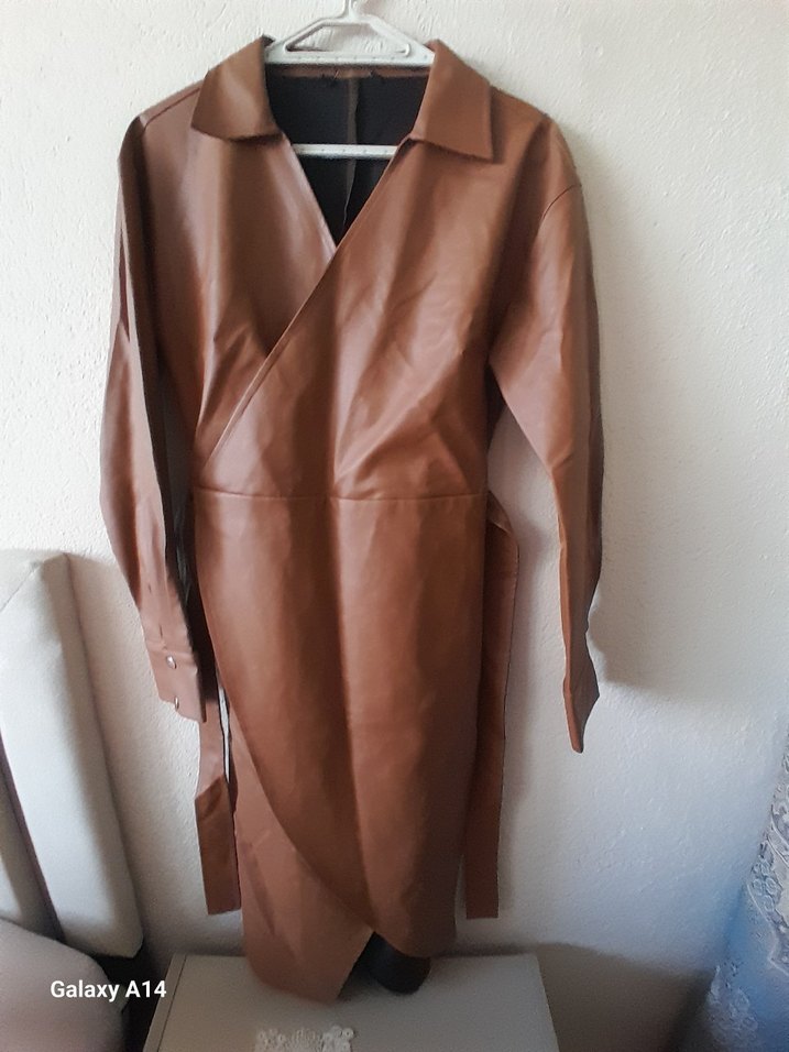 Kahverengi uzun deri trençkot, kuşaklı ve yaka detaylı, uzun kollu ve rahat kesimle sokak stiline uygun. Günlük kullanım için ideal.