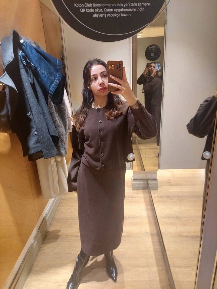 geçen sezon kotondan almıştım gerçekten mükemmmel bi takım 1 kez giydim ama benim ortamıma çok uymuyor kaçırmayın.Kahverengi deri triko elbise, notlu yaka ve uzun kollu, midi boyda ve normal kesimdir. Desensiz tasarımıyla ofis ve iş ortamlarına uygundur, zahmetsiz şıklık sunar.