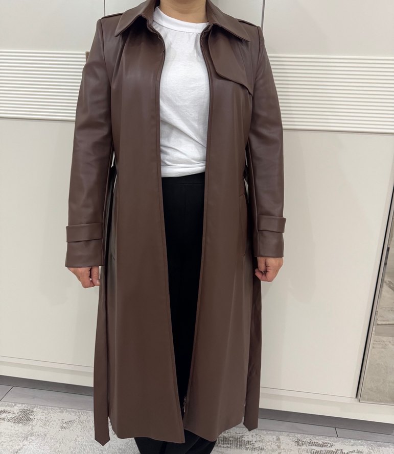 İsterseniz videosunu atarım marka temsili Kahverengi deri uzun trençkot, kemerli ve yakası kesik detaylıdır. Uzun kollu, rahat kesimiyle günlük şıklık sağlar.