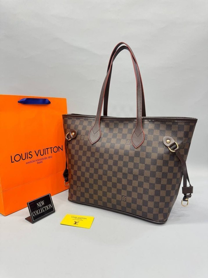 Kahverengi deri, kareli desene sahip, tokalı detaylarla günlük kullanıma uygun klasik kadın çantası. Üzerinde LOUIS VUITTON logosu bulunur.