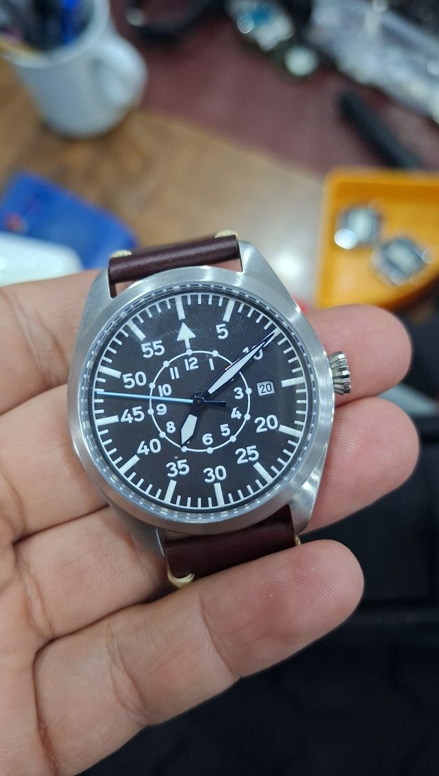 Kahverengi deri kayışlı, siyah kadranda beyaz detaylı klasik erkek saati, tarih göstergeli. ⌚