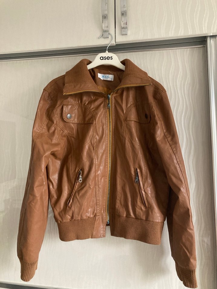 Parlak kahverengi deri, kemerli ve uzun kollu, kesimi vücuda oturan, çıtçıtlı cepler ve yaka detaylı günlük kullanıma uygun kadın ceket. Ases markasına ait.