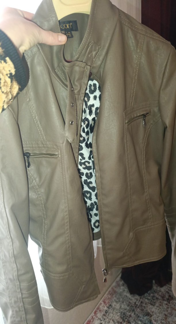 Kahverengi deri, kemerli ve oturan kesim uzun kollu kadın ceket. Leopar desenli astarıyla sokak stiline uygundur fiyat sondur