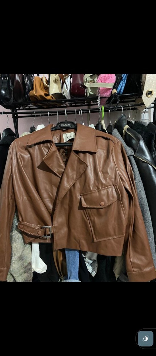 Kahverengi deri kemerli kadın ceket, normal uzunlukta ve notched yaka tasarımlıdır. Strappy kollu, rahat kesim ve günlük sokak stili için uygundur. standart beden hiç giyilmedi çok fazla bu tarz ceketim olduğu için satıyorum.