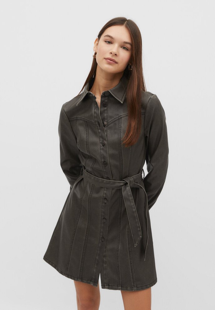 Kahverengi deri kemerli kadın elbise, kemerli bel ve askılı uzun kollara sahiptir. Düzenli kesim ve kesik yaka ile sokak stiline uygundur.