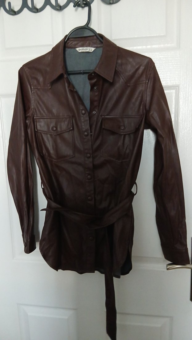 Koyu kahverengi deri gömlek-ceket, kemerli ve fitted kesimlidir. Uzun kollu, yakası notched lapel tarzında, vintage biker stilindedir.