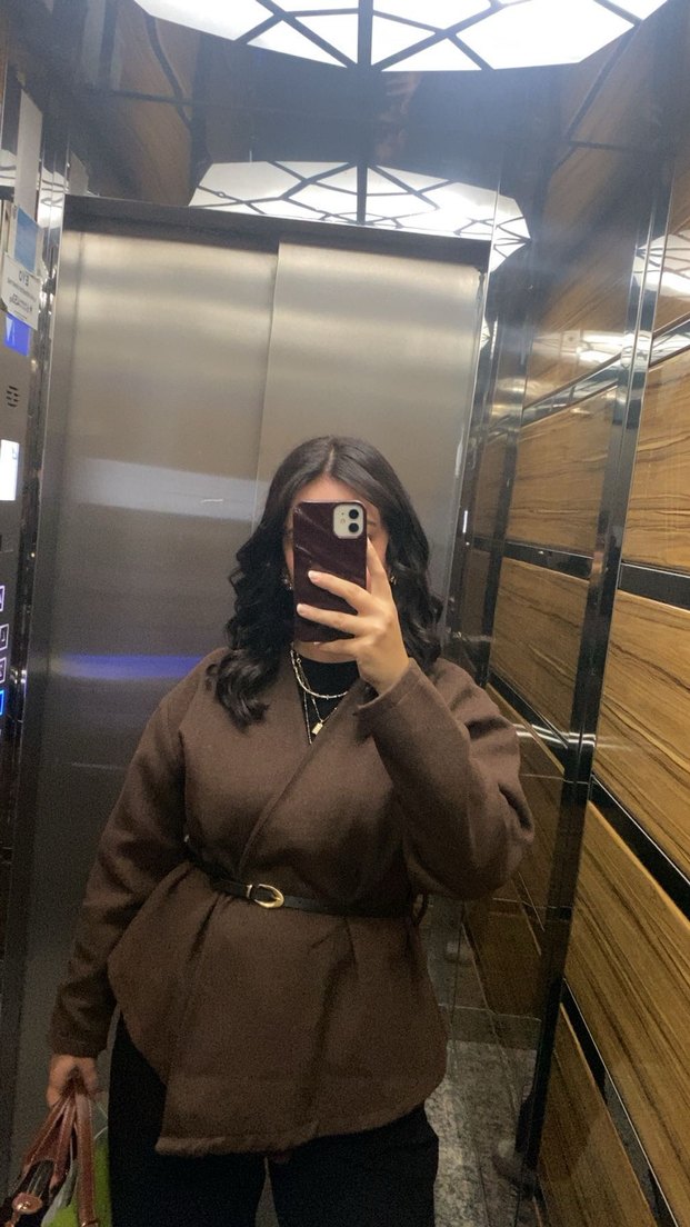 Kahverengi deri kumaştan, kemerli ve kesimi vücuda oturan, uzun kollu midi boy kadın ceket. Sokak modasına uygun, günlük kullanıma uygun şık bir modeldir.