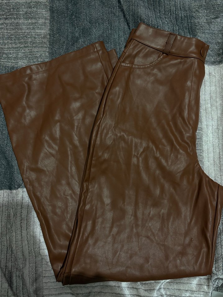 Kahverengi deri, kemerli ve midi boy, dar kesim kadın pantolon. Günlük kullanıma uygun, rahat sokak tarzı için ideal.