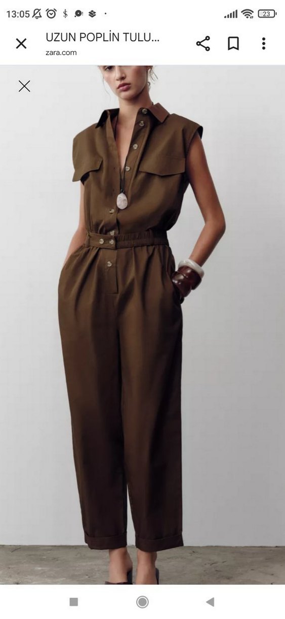 Kahverengi deri, yakalı ve kolsuz tasarımlı tulum, kemerli ve midi boyda. Günlük kullanıma uygun, rahat kesim şık bir parça.