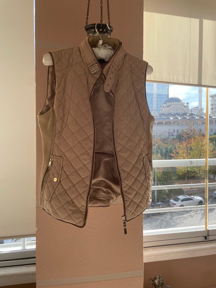 Kahverengi deri, kemerli, yüksek yakalı, kolsuz, parlak yüzeyli, midi uzunlukta kadın yelek. Trendy ve günlük kullanıma uygun.