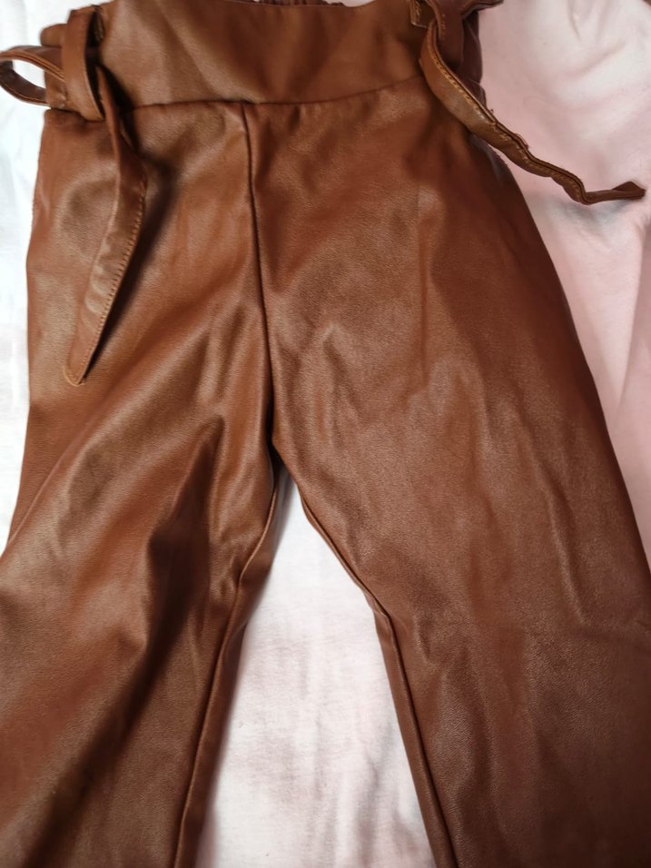 Kahverengi deri, kemerli kız çocuk pantolon, parlak yüzeye sahip, rahat sokak stili için uygundur. Likralidir