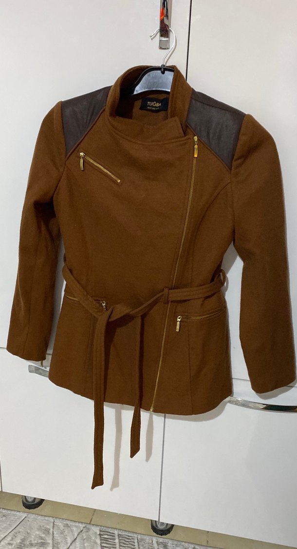 Kahverengi deri, kemerli, notched lapel yakalı, uzun kollu, midi boy, regular fit maternity biker ceket. Satmaya kıyamadığım dar gelen mont