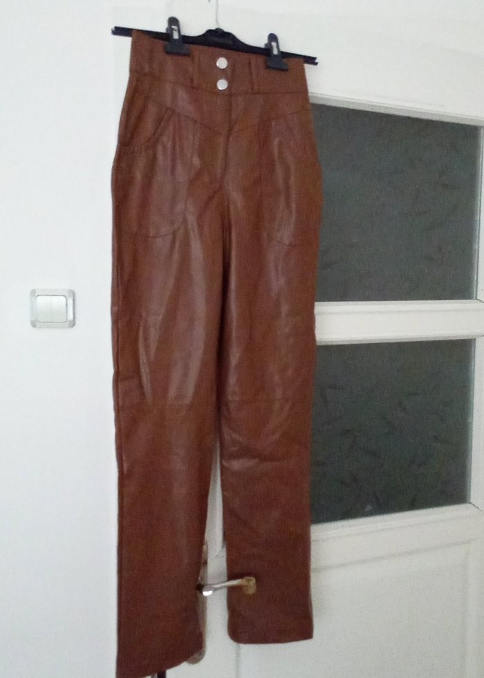 Deri kumaştan yapılmış, kahverengi kemerli midi uzunluğunda kadın pantolon. Normal kesim ve desen içermeyen tasarımı ile ofis kullanımı için uygundur.