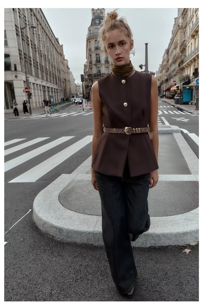 Kahverengi deri, kemerli ve notched lapel yakalı bu kolsuz yelek, midi boyda ve regular fit kesimdedir. Günlük kullanıma uygun trend sokak stili sunar.