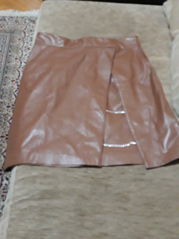 Kahverengi deri mini etek, kemerli ve parlak yüzeylidir. Normal midi boyda, dar kesim ve desen içermeyen tasarımıyla günlük sokak stiline uygundur.
