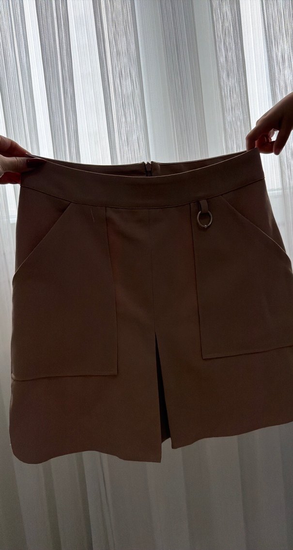 Kahverengi deri mini etek, kemer detayı ve ön ceplerle günlük sokak stiline uygun, vücuda oturan kesime sahiptir.