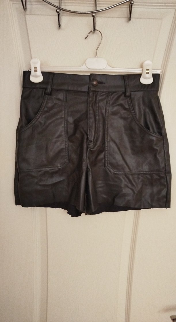 Kahverengi deri, kemerli, bol kesim mini şort. Sokak tarzı ve günlük kullanım için uygundur.