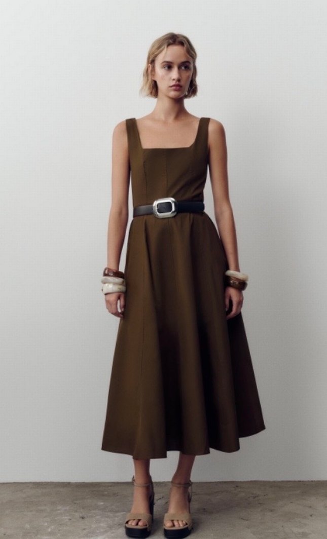 Kare yaka ve kemer detaylı, kahverengi deri kumaştan, kolu olmayan uzun elbise. Regular kesim, sokak modasına uygun.