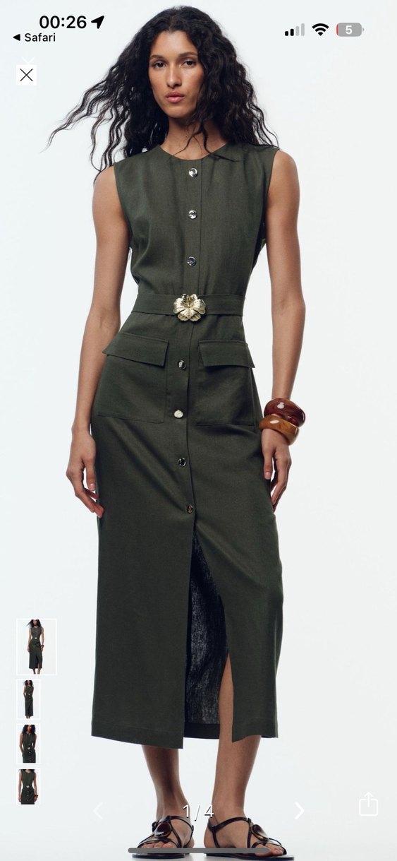 Kahverengi kamuflaj desenli, parlak deri kumaştan, kemerli ve yakalı, kolsuz uzun elbise. Günlük kullanıma uygun, rahat kesim.