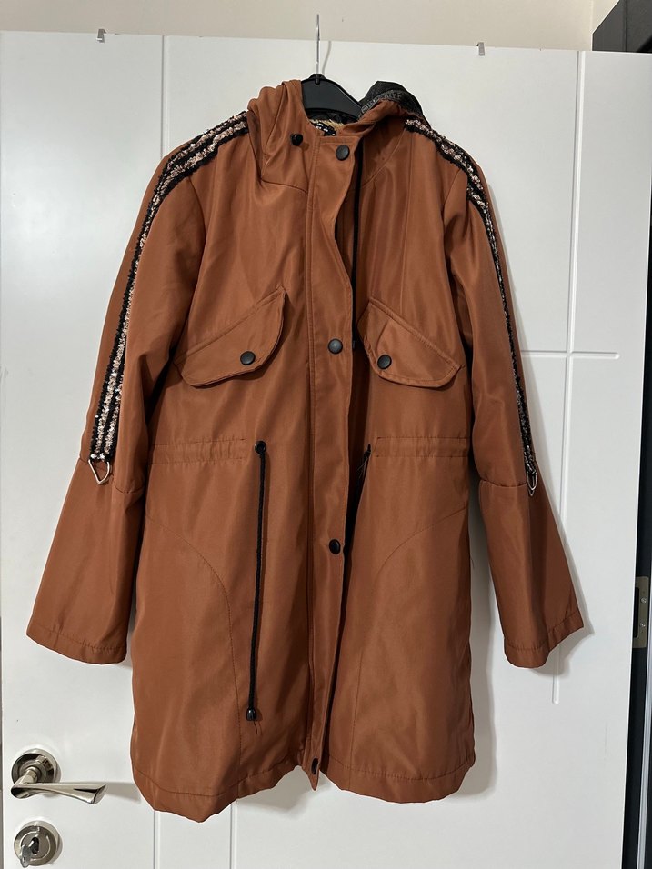 Kahverengi deri, kemerli ve bol kesim uzun yağmurluk. Çentikli yaka ve askılı kollara sahip. Parlak dokusu ve sokak stiline uygunluğu ile günlük kullanım için ideal. ☔