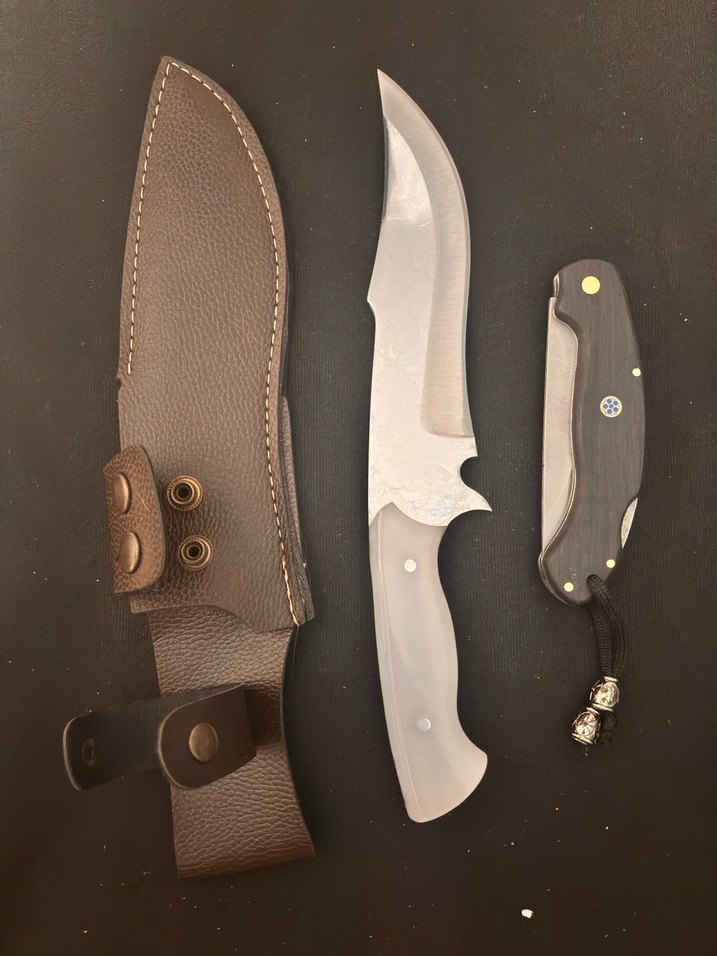 Kahverengi deri kılıflı, büyük sabit bıçak ve katlanır bıçak içeren set. ️