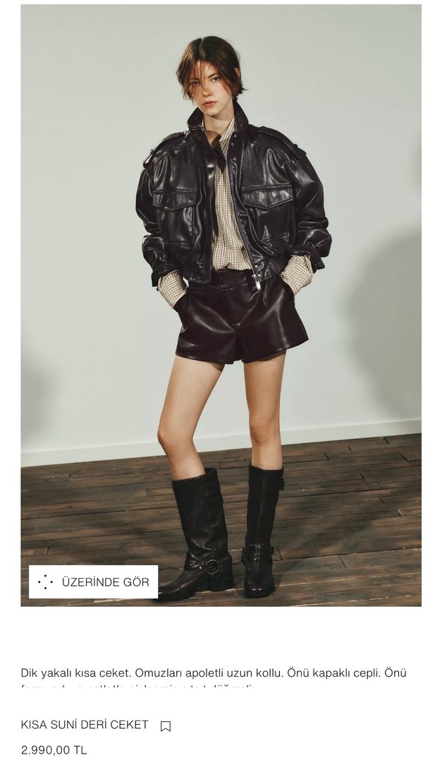 Kahverengi deri, dik yakalı kısa ceket. Omuzlarda apolet ve uzun, askılı kollara sahiptir.