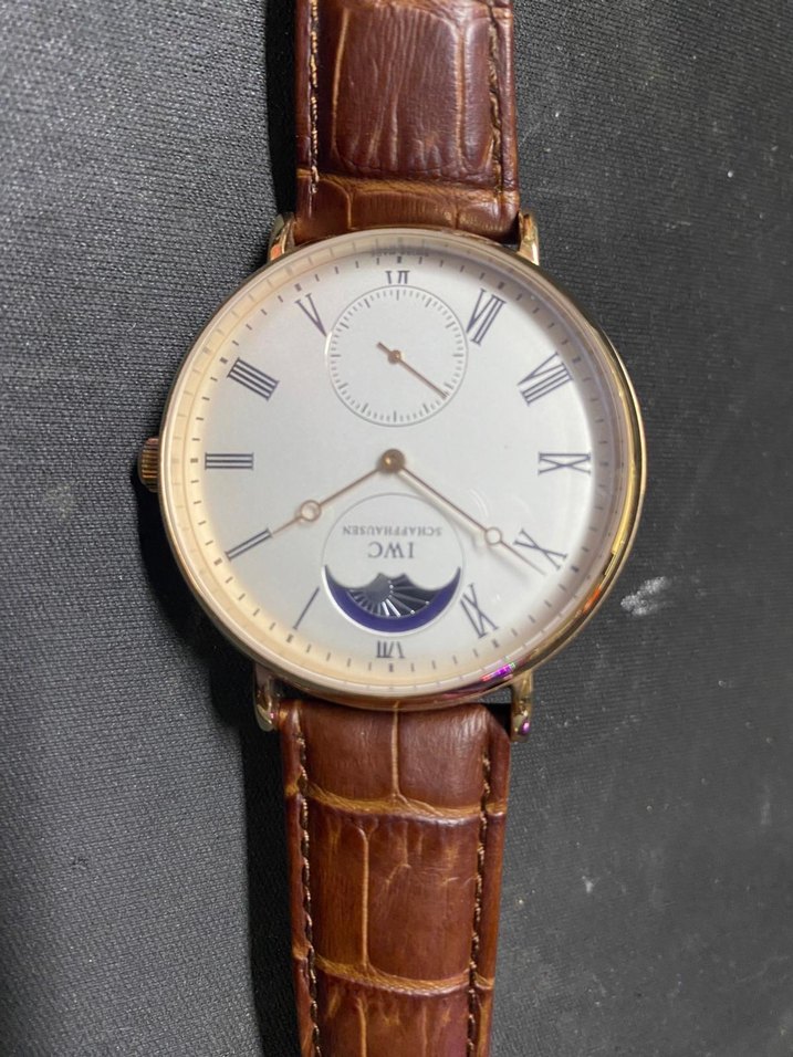 Ürün sıfır. IWC 1. Sınıf replike Roma rakamlı ve koyu kahverengi deri kayışlı erkek saati. Modern klasik tarzda, ek alt kadranlar ve ay fazı göstergesi içerir. ⌚