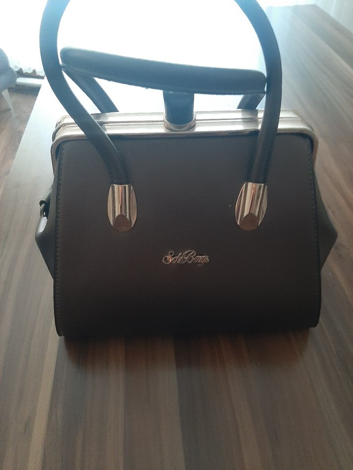 Kahverengi deri, parlak yüzeyli, tokalı detaylara sahip, baskılı desenli modern klasik kadın çantası. Günlük kullanıma uygundur.