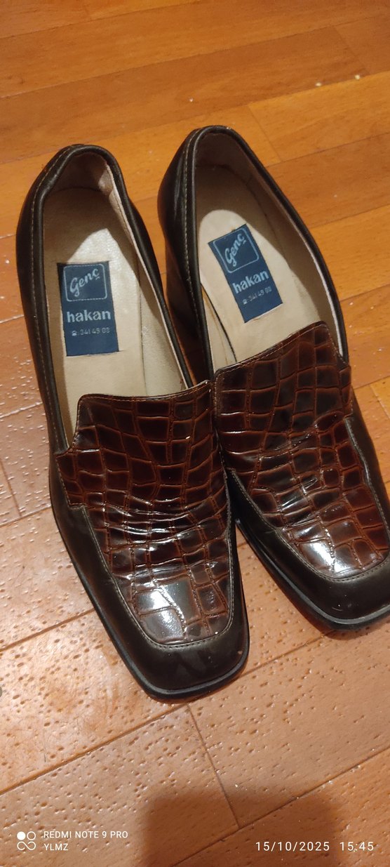 Kahverengi deri, parlak bordo yılan desenli, tokalı klasik kadın ayakkabısı. Blok topuklu ve ofis kullanımı için uygundur.