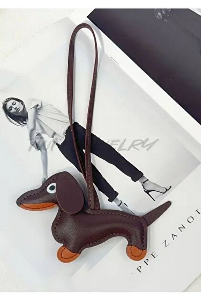 Koyu kahverengi deri köpek figürlü, tokalı askılı, çağdaş Paris tarzını yansıtan anahtarlık. Hiç kullanılmadı. Çantalar için charm.