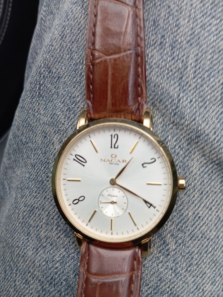 Bej kadranlı, kahverengi deri kayışlı klasik erkek saati. Sayısal işaretler ve küçük saniye alt kadranı görünür. ⌚