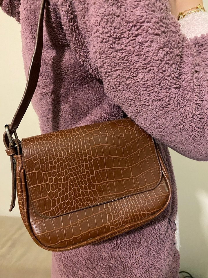 Kahverengi deri, kroko desenli ve tokalı kadın çantası. Sokak stiline uygun, günlük kullanıma ideal.