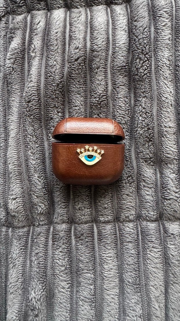 Önünde dekoratif göz figürü bulunan kahverengi deri kulaklık kutusu. Kompakt ve koruyucu tasarım. Airpods 3.nesil
