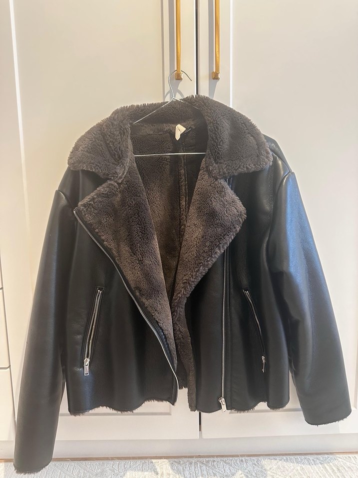 Kahverengi deri, kürklü detaylı, yakalı ve uzun kollu dar kesim biker ceket. Normal boyda, desen içermeyen günlük kullanım için uygun.