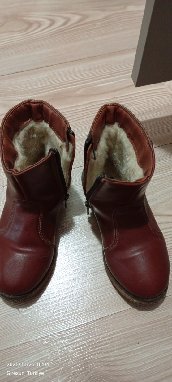 Kahverengi deri,çocuk botu içi sıcak kürk detaylı ve parlak görünümlü. Desensiz, klasik tarzda tasarlanmıştır.