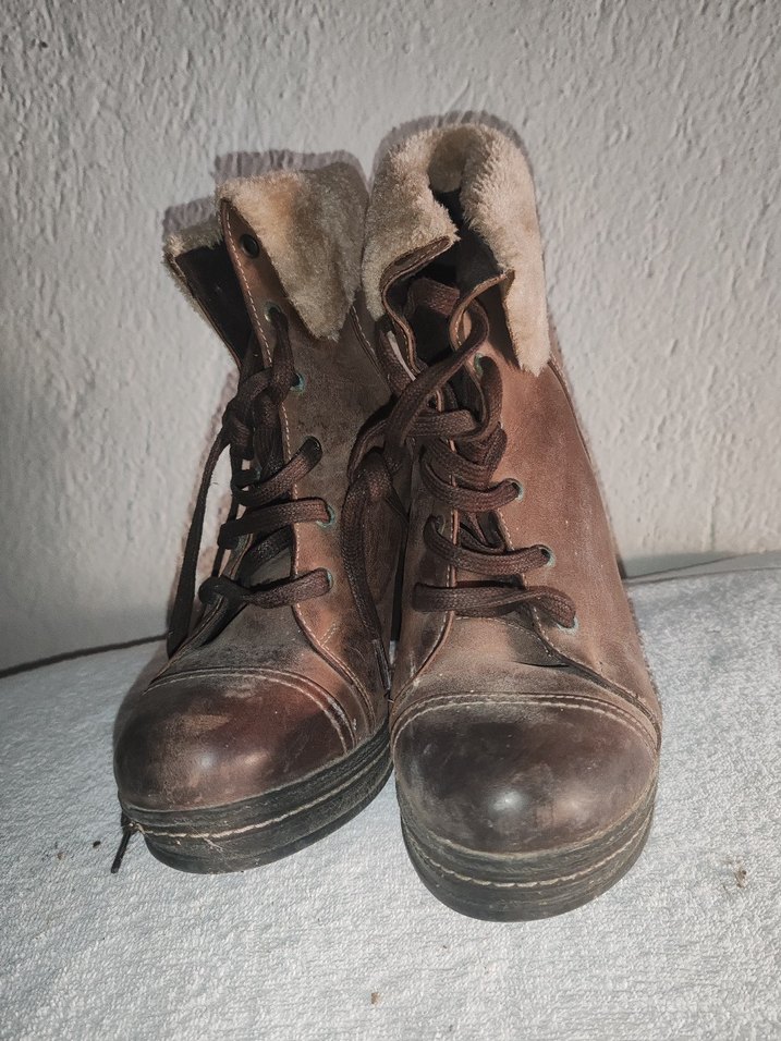 Amerikadan almıştım büyük geldi durmaya bağlı tozlandi yırtık deforme yok hiç giyilmedi Kahverengi deri, kürk detaylı dolgu topuk botlar. Sade desensiz tasarımıyla rahat ve sıcak bir görünüm sunar.
